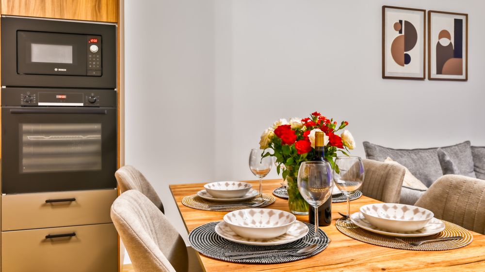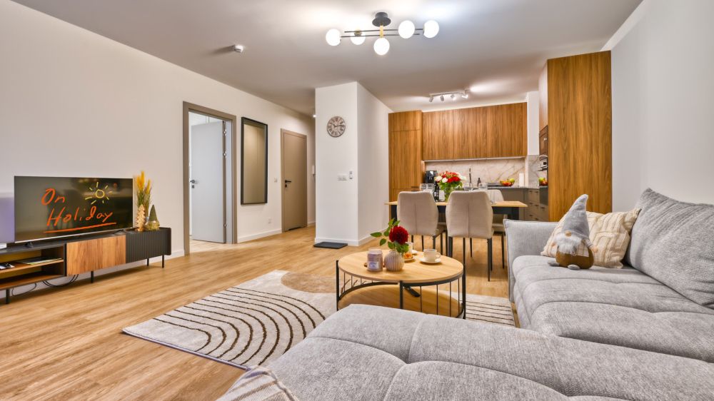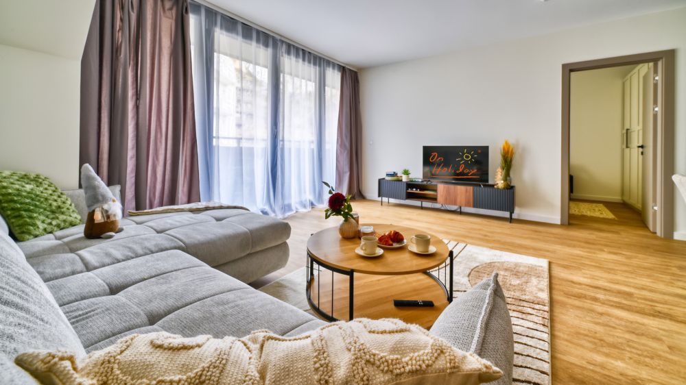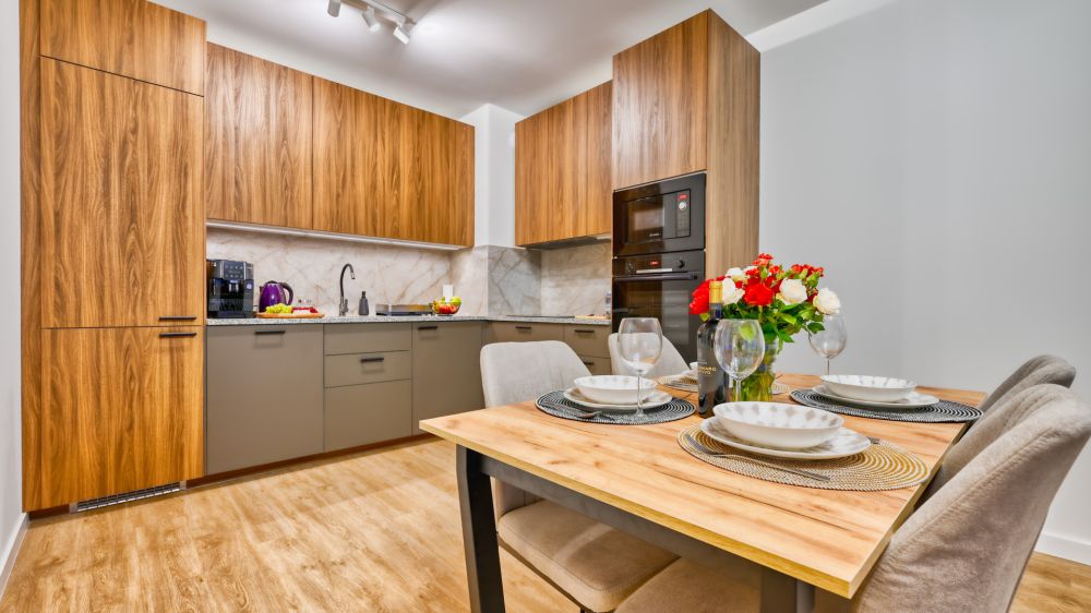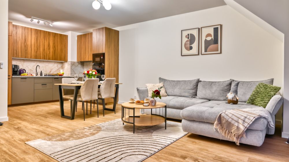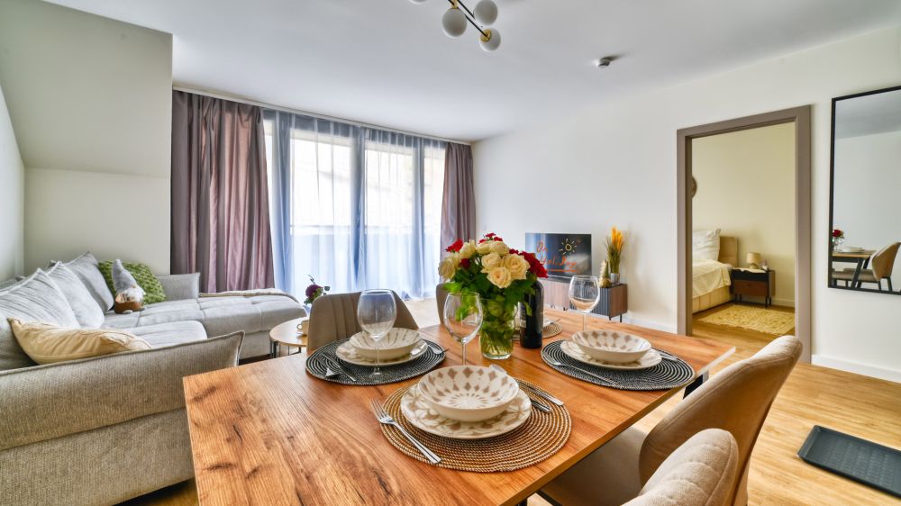 Salon z aneksem kuchennym – nowoczesnie wyposażony, ze stołem, rozkładaną sofą, pełnym zestawem kuchennym (m.in. lodówka, czajnik, telewizor) .