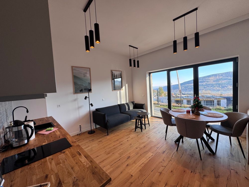 Z okien i terenu apartamentu roztacza się malowniczy widok na Góry Izerskie i panoramę miasta, co sprawia, że każdy poranek zaczyna się tu wyjątkowo. To miejsce, w którym odpoczniesz od zgiełku codzienności, zregenerujesz siły i naprawdę się zrelaksujesz.